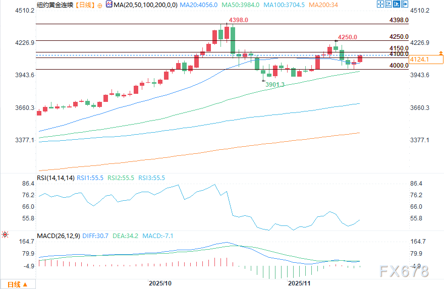 技术面分析:12月黄金期货多头下一个上行目标是收盘价突破坚实阻力位——历史纪录高点4398.00美元。空头的下一个短期下行目标是将期货价格推低至4000.00美元下方坚实技术支撑。第一阻力位见于4150.00美元,其次4200.00美元。第一支撑位见于隔夜低点4056.10美元,其次4000.00美元。随着今日盘中金价进一步突破4150美元,短期技术面显示多头动能增强,下一关键阻力已移至4200美元整数关口。若美联储纪要偏鸽派,可能推动金价测试4300美元附近。