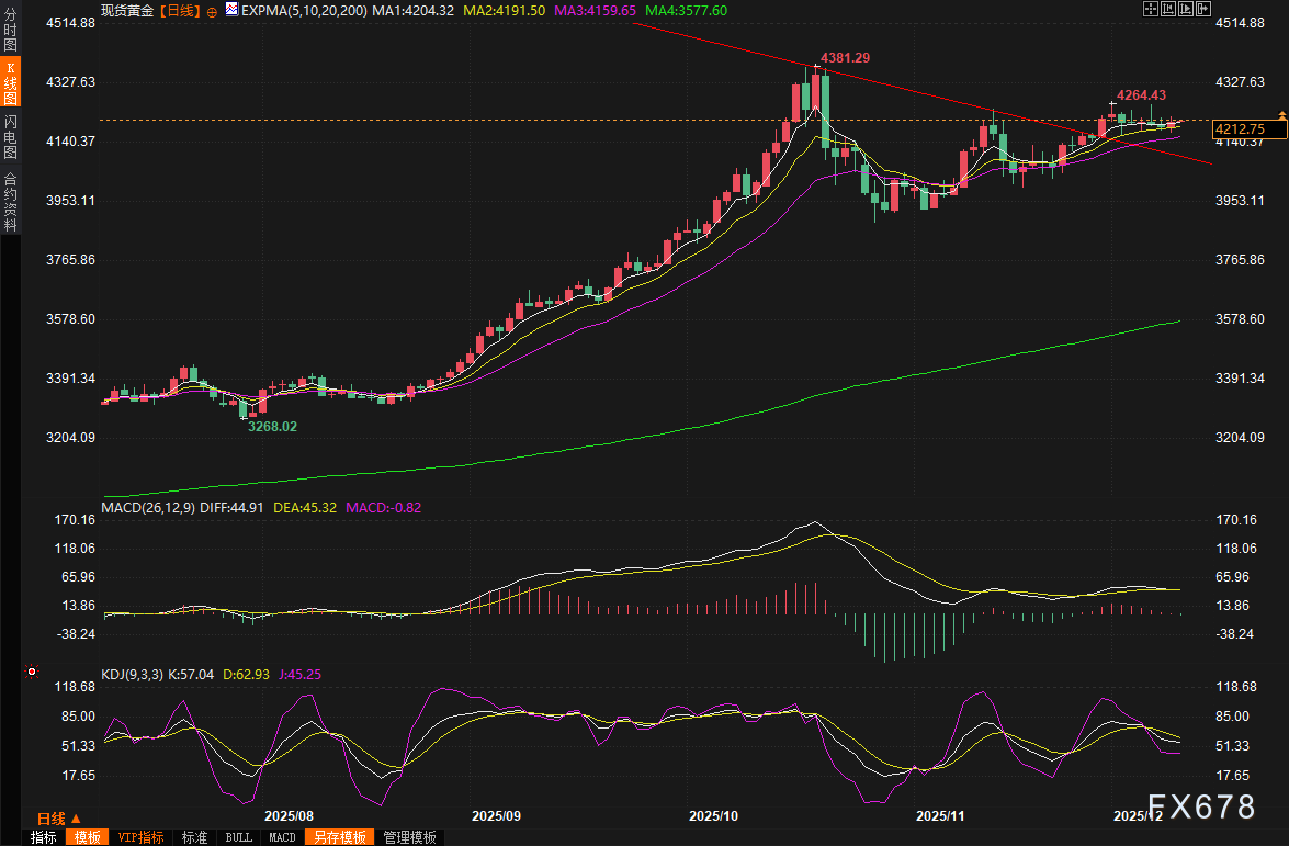 周三(12月10日)亚市早盘,现货黄金窄幅震荡,目前交投于4210美元/盎司附近。周二现货白银大涨逾4%,在供应紧张的情况下升破每盎司60美元的里程碑,再度刷新历史高点,这也带动金价上涨,市场普遍预计美联储周三降息,吸引逢低买盘支撑金价,不过周二出炉的美国职位空缺数据好于市场预期,美元指数延续反弹走势,美债收益率刷新三个月高点,这令黄金多头有所顾忌。