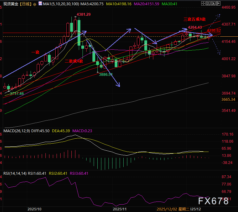 周二(12月9日)亚欧时段,黄金价格二次下探了一周低点附近,之后受到美元指数带动反弹们目前在4200美元关口附近整理,一方面,美联储降息预期持续发酵,另一方面,周一基准10年期美国国债收益率攀升至2个半月高点,原因是市场猜测美联储主席杰罗姆·鲍威尔在会后新闻发布会上可能释放“进一步降息门槛提高”的鹰派信号,这一因素持续对黄金构成压制。