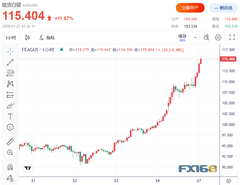 FX168财经报社(北美)讯 周一(1月26日),汇市与贵金属市场的“避险链条”被全面点燃:在市场押注美日可能协同行动支撑日元之际,美元跌至四个月低点,日元强势反转;美元走弱叠加对美国政策不确定性与政府停摆风险的担忧,推动黄金史上首次站上5000美元并一度上探5100美元上方,白银则暴涨超11%至115美元创纪录。与之形成对照的是,美股在风险与避险并行的背景下仍实现反弹,投资者把目光转向本周的美联储利率决议以及科技巨头财报潮,市场波动或进一步放大。