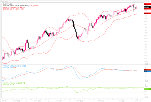 上周五(10月6日),美元兑日元上涨0.54%,报149.31仍徘徊在150日元关口附近。上周五美国公布强于预期的非农就业数据后,美国利率期货走势显示,市场预计美国联邦储备理事会(FED/美联储)年底前加息可能性为42%,高于周四的约33%。美国公债的快速抛售,收益率升至多年高点,指标10年期公债收益率达到4.887%,30年期公债收益率达到5.053%,均为2007年以来最高,而两年期公债收益率最高升至5.151%,维持在9月21日创下的5.202%水平之下。对公债收益率变化敏感的美元/日元的交易,直至当前仍受着收益率差的影响,美元仍无转弱的迹象显现。只是在接近150警戒水平之际,交易员一直在防范日本央行可能的干预而导致汇价显得有点逡巡不前。近期还是要密切留意150水平的压制情况,若不能冲破,则需谨防调整回落的风险。