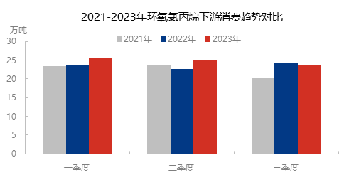 从以上图中可看出,2023年1-9月份国内环氧氯丙烷延续了2022年下半年的低迷行情,但2023年因成本削弱、供应增加以及需求不及预期等利空消息夹击,供需矛盾进一步加剧,导致价格持续低位调整行情之中。其中三季度国内环氧氯丙烷延续低迷行情走势,供应过剩局面难改善,三季度平均价为8173元/吨承兑送到,同比下降27.21%,其中价格最高值在7月底的8600元/吨,最低价为7月初的7250元/吨承兑送到。
