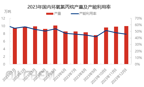 2023年三季度部分生产企业因上游装置问题及下游需求不及预期,国内环氧氯丙烷行业供需整体表现偏弱,需求举步维艰更为明显。供应面来看,7月份因产能利用率相对稳定,产量波动有限,8-9月份产量逐步缩减。三季度国内环氧氯丙烷总产量为24.56万吨,环比减少11.94%。