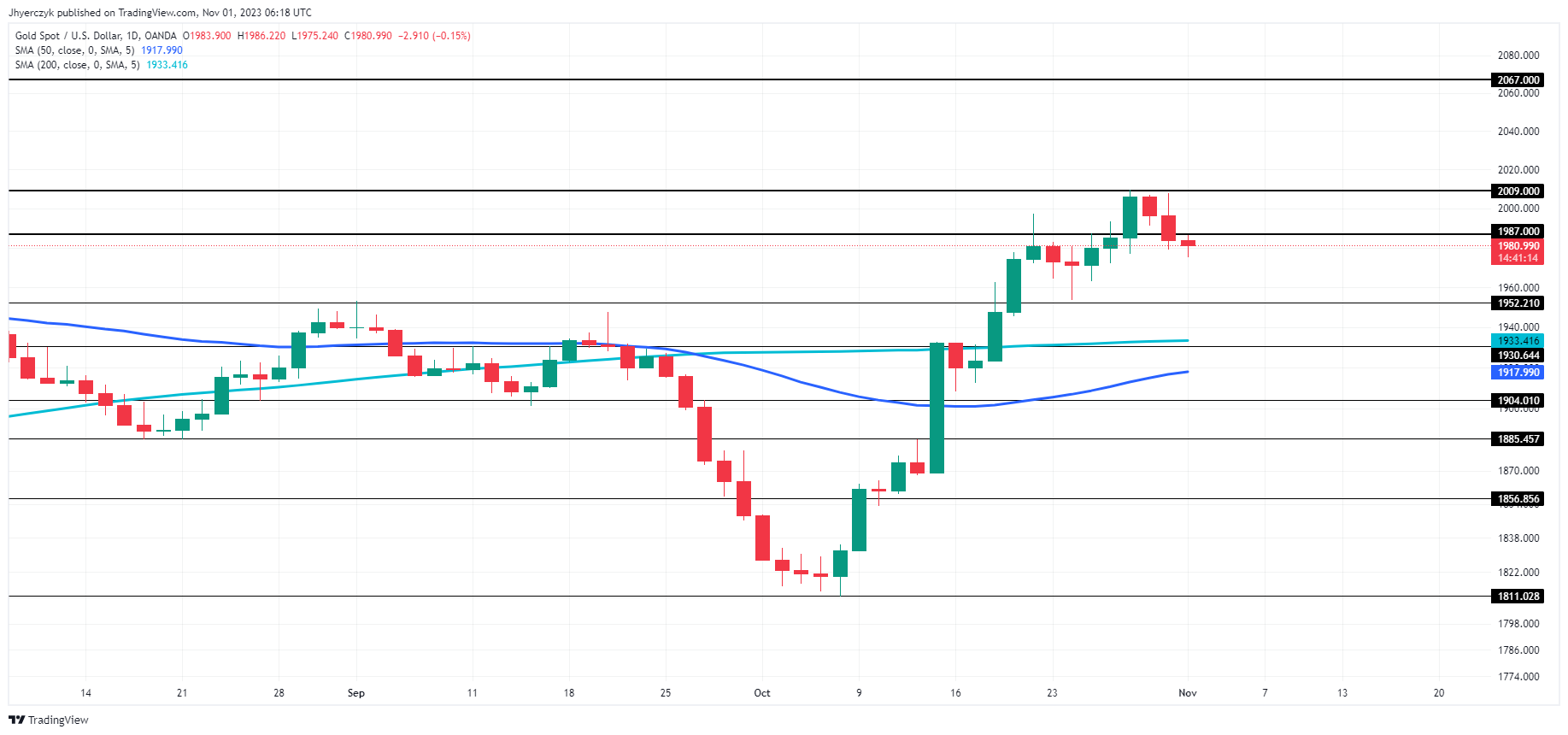 尽管经历了之前的飙升,但黄金市场似乎仍停滞不前,在10月份上涨7.3%后表现出疲态。目前,该资产的交易价格为1978.36美元,美国黄金期货也下跌0.4%,至1987.00美元。
