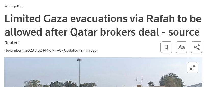 消息人士补充说,该协议将允许外国护照持有者和一些重伤人员通过埃及和加沙之间的拉法过境点离开,但没有具体说明该过境点将开放多久。
