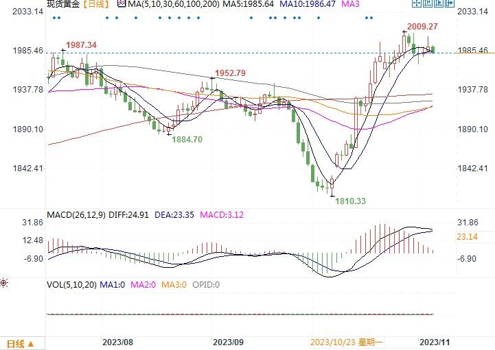 上周五(11月3日),虽然美国非农数据显示降温明显,但黄金走势依然显得纠结,虽录得小幅度上涨,但收盘仍低于2000美元关口之下。周五当日现货金收报1992.32美元/盎司,日涨幅仅6.85美元,整体仍未有什么新的突破性表现。