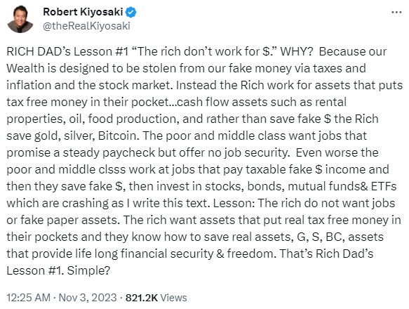 清崎在推特写道:“富爸爸的第一课是,富人不为金钱工作,为什么?因为我们的财富都是通过税收、通货膨胀和股票市场,从这些假美元的管道窃取的。”