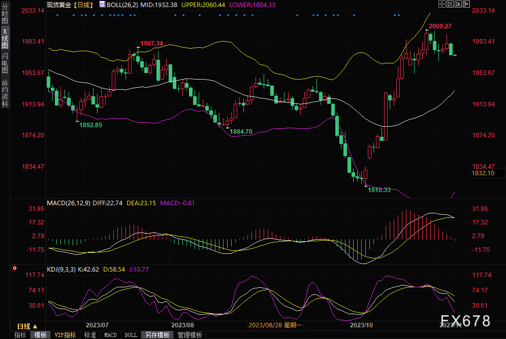 现货黄金周一收跌0.73%,收报1977.78美元/盎司。