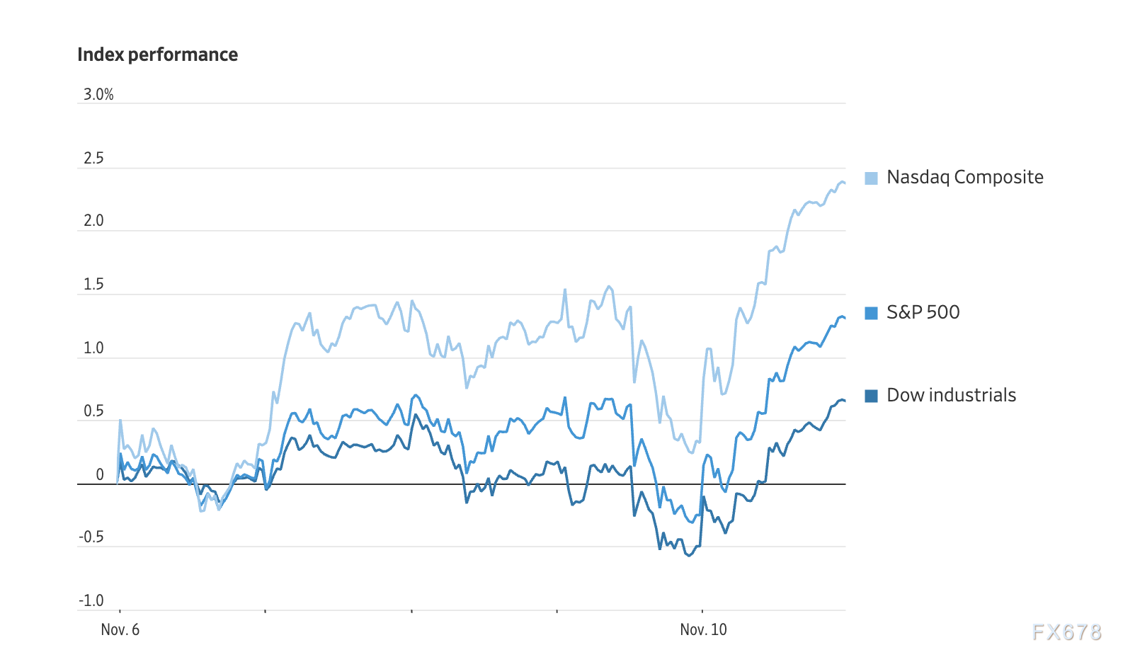 上周五,标准普尔 500 指数上升 67.89 点或 1.6%;道琼斯工业平均指数上升 391 点或 1.2%;纳斯达克综合指数上升341.22点或 2.6%。使 11 月有望成为今年最好的月份之一。