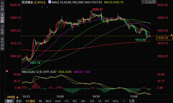 现货黄金上周五收市大跌20.38美元,跌幅1.04%,收报1938.07美元/盎司,金价盘中最低触及1932.99美元/盎司。