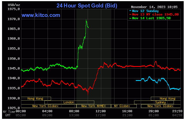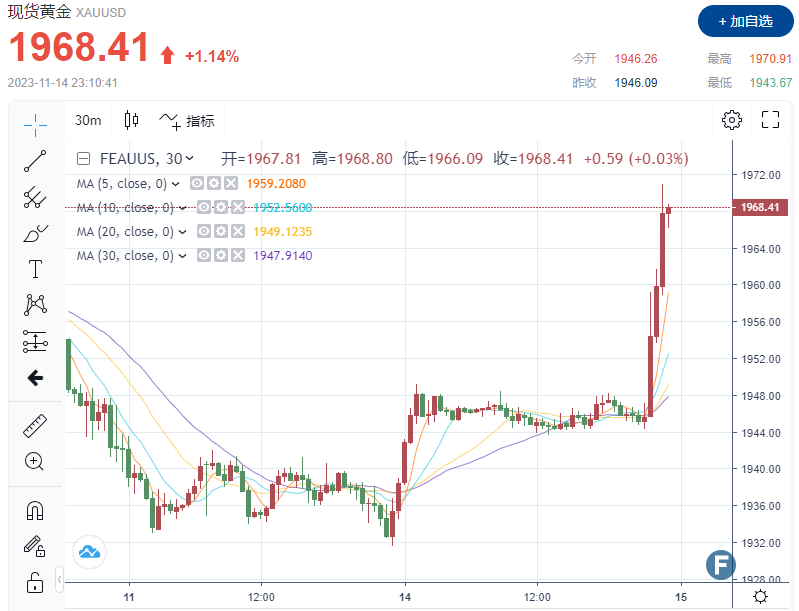 美国CPI数据公布后,贵金属价格持续走高,突破1970,现报1965.49美元/盎司,日内涨幅1.41%。