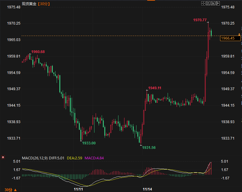 美国CPI数据公布后,贵金属价格持续走高,突破1970,现报1965.49美元/盎司,日内涨幅1.41%。