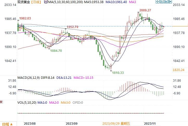 周三(11月15日), 黄金在一周高点下方企稳,当日略跌0.1%,收盘在1959.09美元/盎司水平。