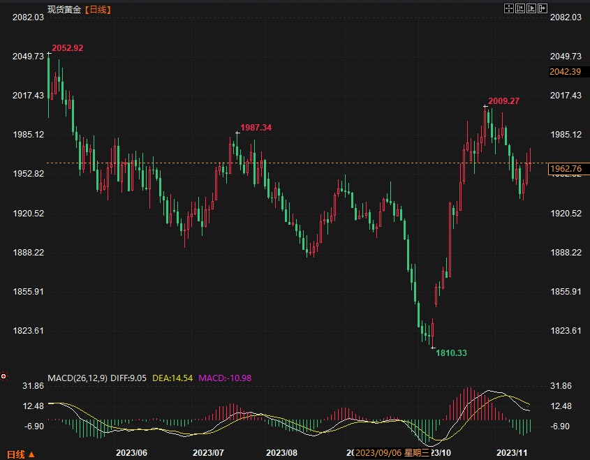 随着美元上涨,金价周三下跌,而对美联储可能结束加息的预期限制了金价的跌幅。截至发稿,现货黄金下跌0.03%,至1,962.22美元/盎司。
