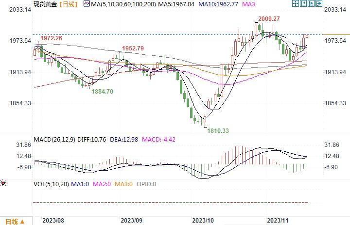 周四(11月16日), 美国公布的上周初请失业金人数增幅超过预估,进一步巩固美联储将暂停加息周期的预期,美债收益率下跌,金价则大幅上涨逾1%,收盘在1,983.29美元,创10天新高。