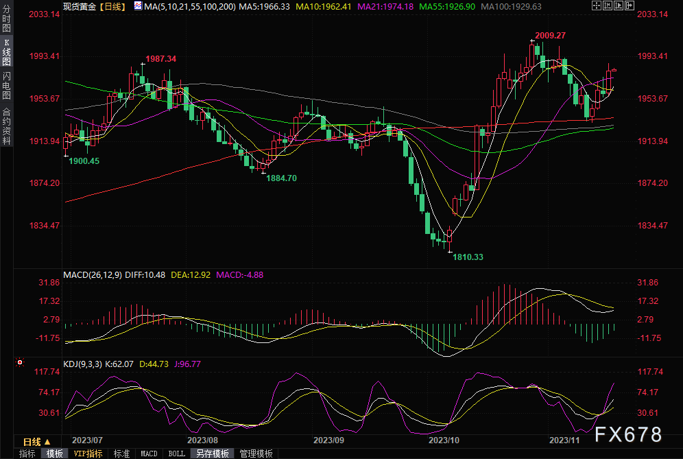 周四(11月16日),现货黄金大幅上涨,重拾涨势。受美元疲软和国债收益率下降的提振,金价突破1975美元阻力位并跃升至一周多来的最高水平1987.85美元/盎司,价格上涨超过20美元,也是受到技术因素的推动。