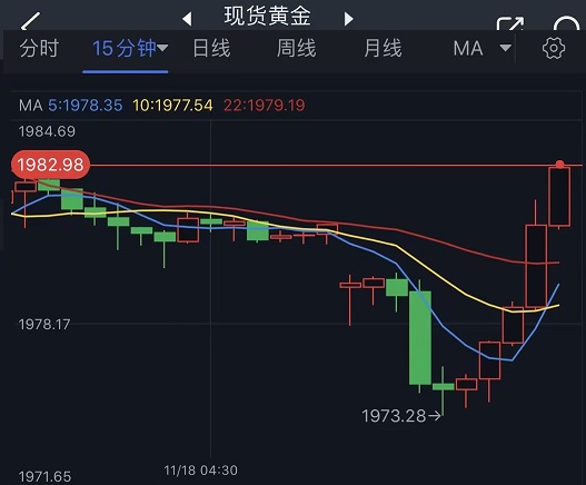周一(11月20日)亚市盘中,现货黄金短线突然快速上升,金价刚刚突破1980美元/盎司关口,短线涨幅达到近10美元。