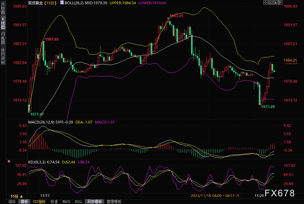 周一(11月20日)亚市盘中,现货黄金探底回升,在跌至1973美元附近后快速拉升近10美元至1983美元附近,目前交投于1981美元/盎司附近。