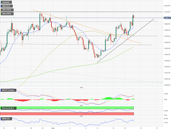 24K99讯 周三(11月22日)亚市盘中,现货黄金在昨日大涨之后小幅回落,金价现报1996美元/盎司附近。FXStreet分析师Matías Salord最新撰文,对黄金技术前景进行分析。