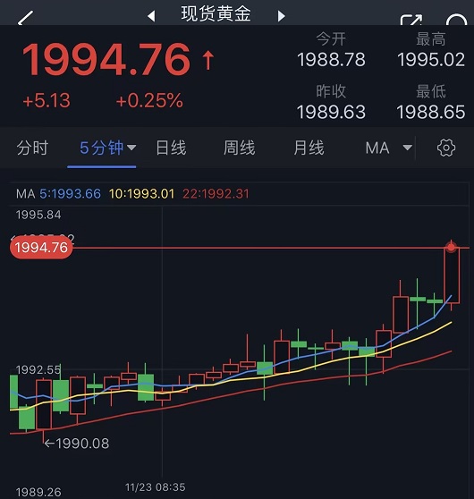 香港时间10:05,现货黄金报1994.76美元/盎司。