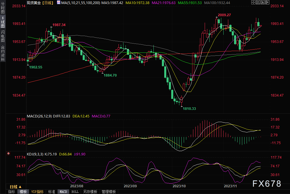 尽管金价回落至1990美元/盎司以下、接近10日均线,并面临2000美元/盎司的阻力,但仍有上升潜力。