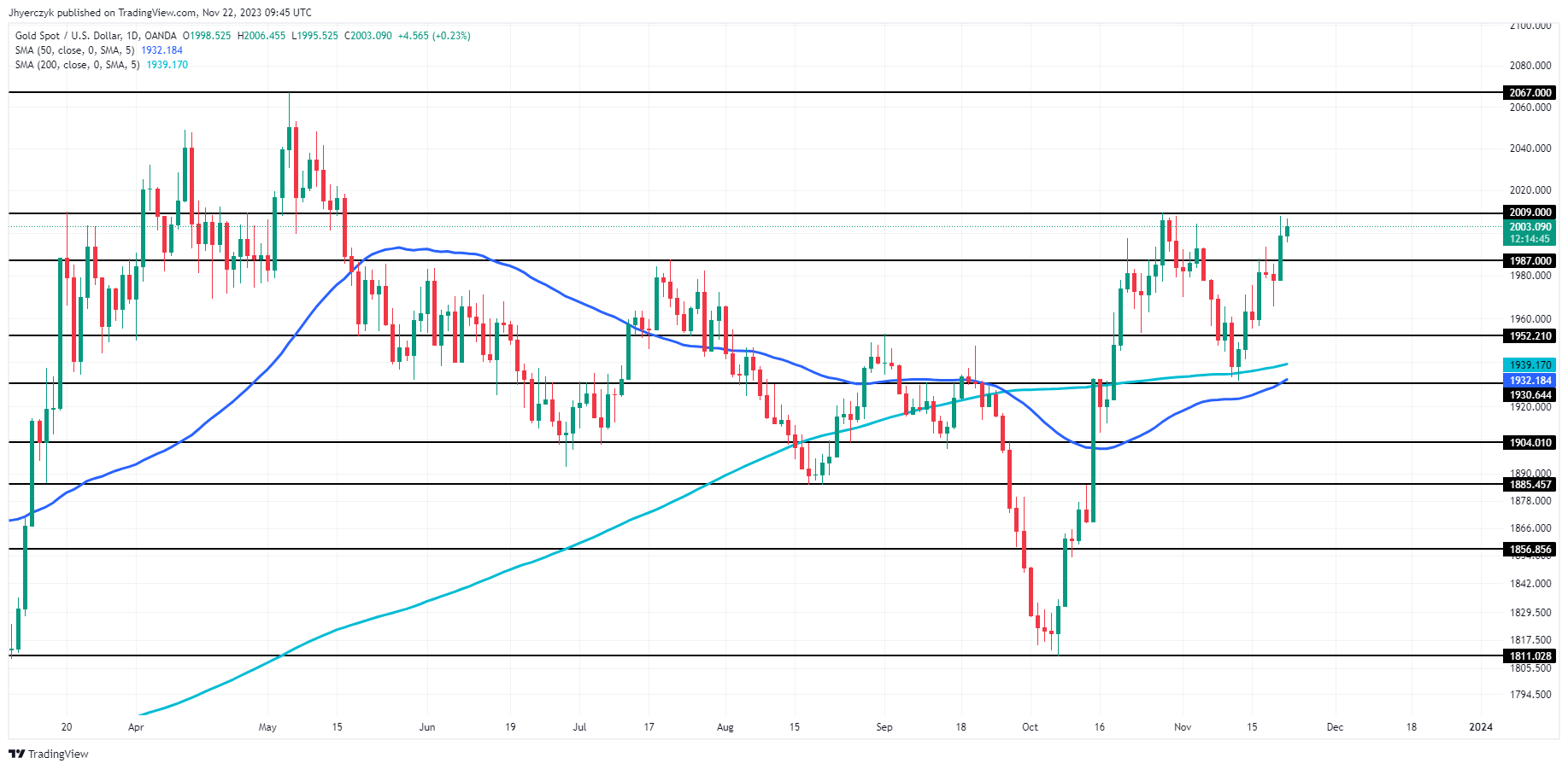 由于市场认为美联储的紧缩周期可能已接近尾声,黄金受美元疲软和美国债券收益率下降的提振,价格维持在关键的2000美元大关附近。