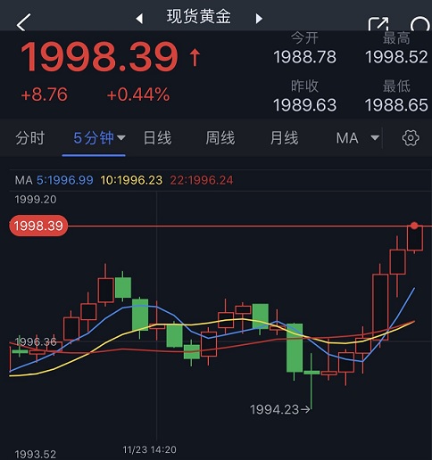 (现货黄金5分钟图 来源:)