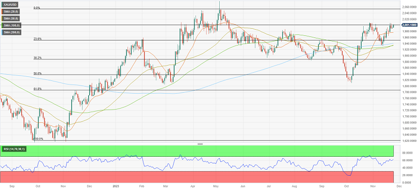 24K99讯 受美元走软推动,现货黄金本周收市大涨逾20美元,并站上2000美元/盎司关口。FXStreet分析师Eren Sengezer周五(11月24日)撰文称,黄金前景依然看涨。下周金价可能受到美国重要经济数据和美联储官员讲话的影响。