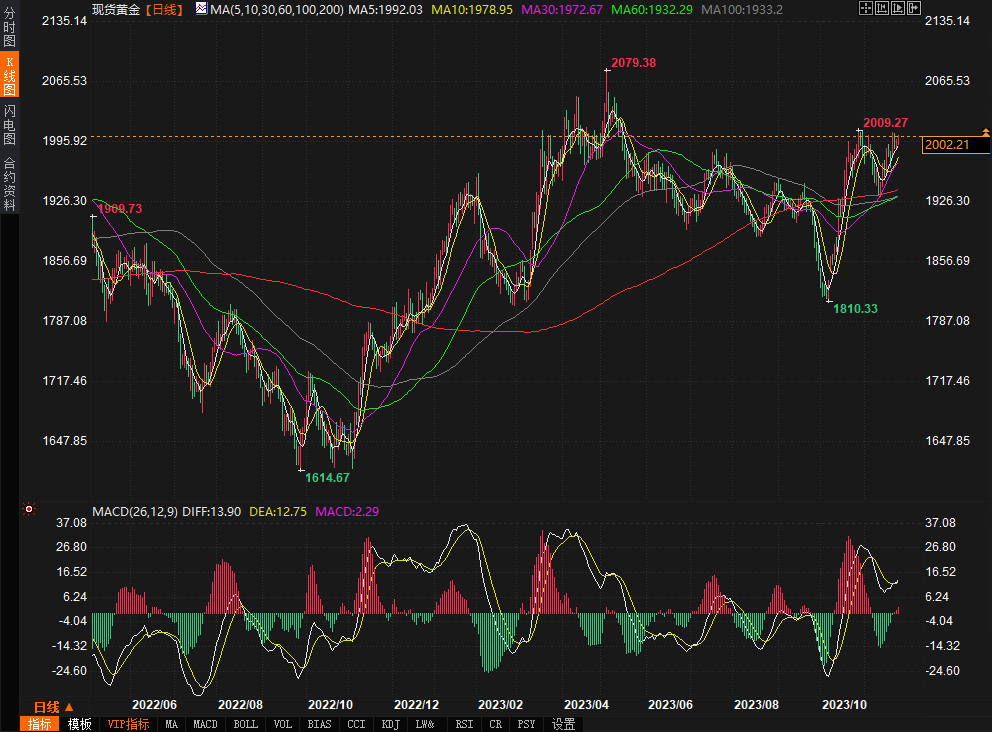 现货黄金收涨0.49%,收报2002.48美元/盎司,接近本月最高价位。