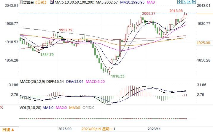 周一当天来自美国数据显示,10月美国新屋销售降幅大过预期,经季节性因素调整后销售年率为67.9万户,下降5.6%。9月读数下修至71.9万户,前值为75.9万户。经济数据走软进一步助长对美联储转鸽的押注,芝商所联储观察工具(CME FedWatch)显示,美联储明年5月降息至少25个基点的可能性略高于50%。在美联储就其利率计划提供更多信息之前,黄金可能会暂时固守在2,000美元附近。接下来,投资者的注意力将集中在周三公布的美国第三季度国内生产总值(GDP)数据和周四公布的个人消费支出(PCE)物价指数上,后者是美联储首选的通胀指标。若是上述这些关键数据继续表现不佳,将极大助燃美联储停止加息并在明年很快将进入降息的预期。在这种市场情景之下,预料黄金进一步向高水平上升走势将是大概率的事情。但是在一片乐观情绪之下,也要谨慎提防数据飞出黑天鹅所导致的黄金在获利回吐之下的大幅回落风险。