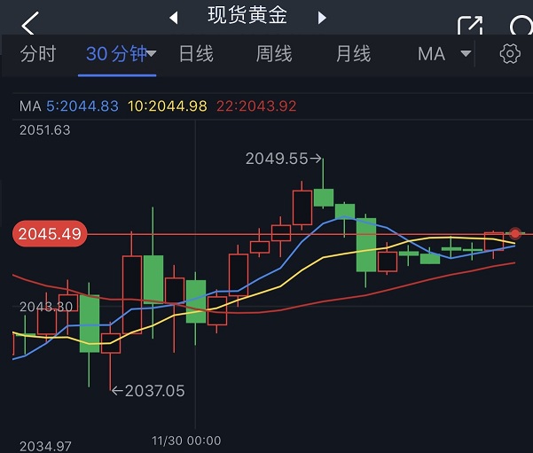 周三(11月29日),因美国GDP数据表现强劲,美元指数周三自三个半月低点小幅回升。现货黄金一度急跌至2040美元/盎司下方,但对美联储在明年上半年降息的预期令金价依然受到支撑,金价随后大幅反弹至略低于2050美元/盎司的水平。