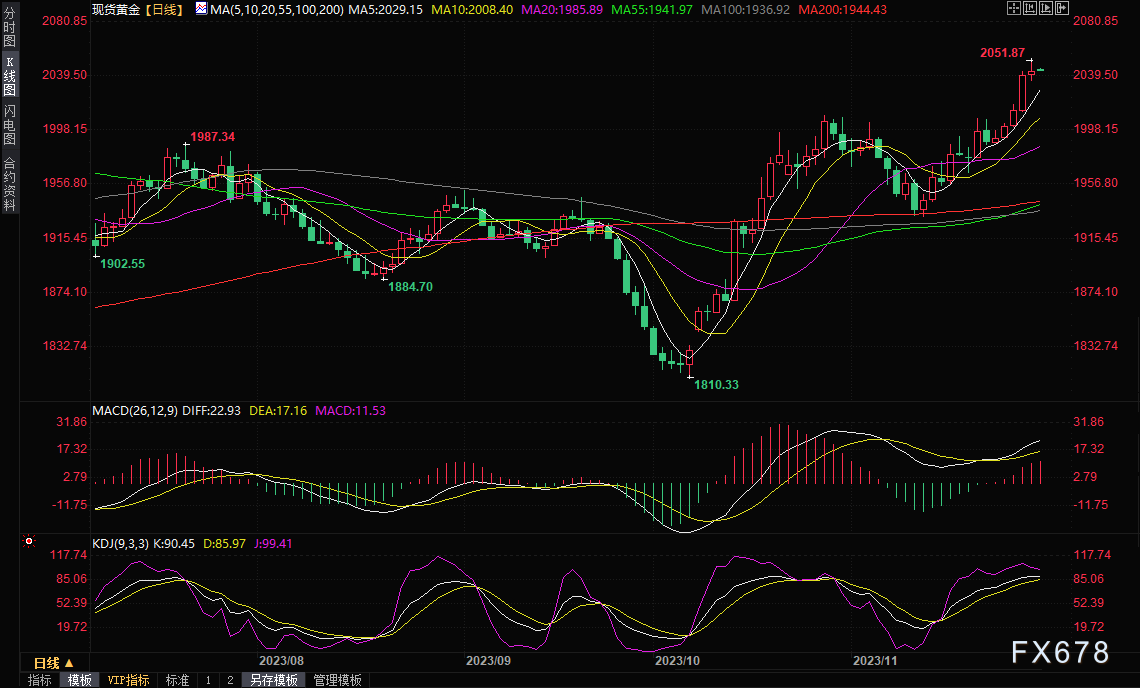 现货黄金周三收涨0.13%,收报2043.90美元/盎司。