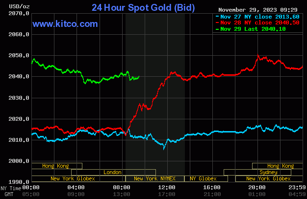 周三(11月29日)美市中, 随着市场对第三季度经济活动强于预期的反应,金价已从每盎司2,050美元以上的隔夜高点回落。