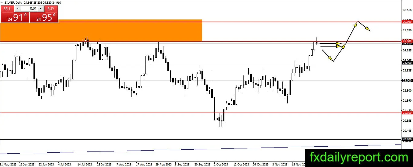 白银价格成功达到25.00美元至26.00美元区域,今天的交易出现看跌反应。价格有可能开始看跌调整并走向23.00美元至23.90美元区域。交易者可以利用出现的看跌调整作为建立多头头寸的机会。