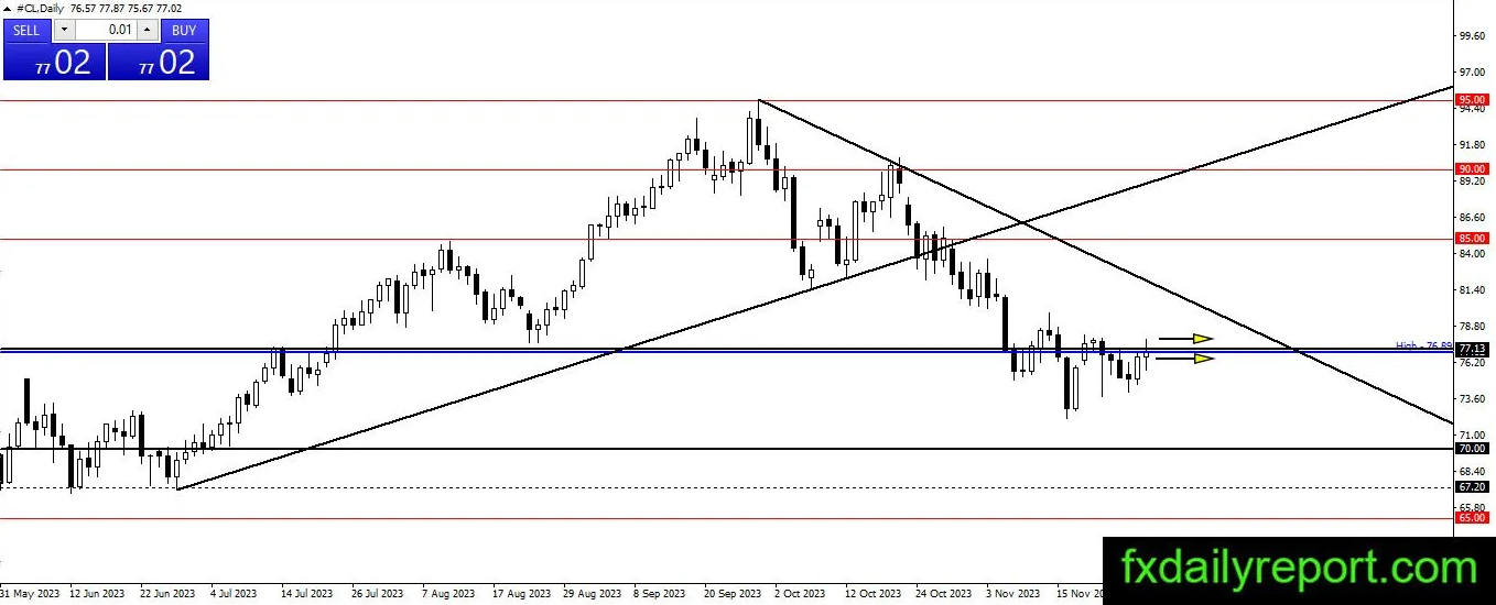 原油价格在77.13美元附近没有进一步的反应。价格仍在该点附近横盘整理,交易者现在只能等待。目前价格有可能会以强劲的势头继续向上走,也有可能价格会出现下跌,恢复向下的趋势,而70.00美元则成为下方的目标。
