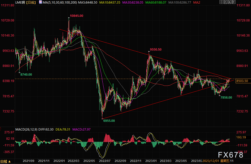 周五(12月1日)亚洲时段,伦铜期货主力小幅冲高,延续近期上涨势头,最高触及8507美元/吨,为9月15日以来新高,截止13:13,目前回落至8472美元/吨附近。