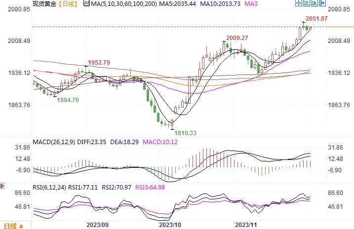 周四公布的美国10月核心PCE物价指数月率录得0.2%,符合市场预期,前值为0.3%;美国10月核心PCE物价指数年率录得3.5%,符合市场预期,前值为3.7%;美国10月个人支出月率录得0.2%,符合市场预期,前值为0.7%。有评论称,美国10月消费者支出温和增长,PCE年率为2021年初以来最小,需求降温的迹象可能进一步强化对美联储加息已经结束的预期。消费者支出出现放缓反映了利率上升和低收入家庭过剩储蓄耗尽的影响。尽管工资水平仍处于高位,但随着劳动力市场趋缓,涨幅较今年早些时候有所放缓。由于担心经济可能在2024年初陷入衰退,美国家庭可能不愿消费而是增加储蓄。经济学家对第四季度的增长预期大多低于2%。需求降温也可能有助于让政策制定者相信,通胀压力将继续减弱,从而强化美联储已经结束加息的预期。但是周四的数据虽然显示通胀仍处于放缓之中,但放缓幅度有限,因此笔者认为该项数据还不足以撼动美联储决策者维持高利率的想法。周五晚间鲍威尔还将就货币问题发表讲话,要小心鲍威尔对市场预期不再升息的看法浇冷水,果真如此美元就有望继续反弹,而黄金恐怕会面临短线获利回吐的调整风险。相反,若鲍威尔意外放出鸽声,黄金极有可能鼓气劲升。