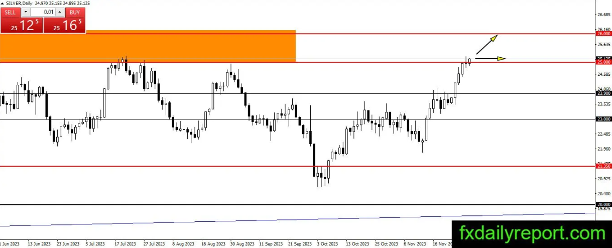 白银价格连续两天收于25.00美元关口附近。今天看涨走势仍在继续,价格目前升至25.00美元上方。涨幅可能会继续直接升至26.00美元大关。如前所述,收盘价高于26.00美元将确认长期看涨趋势。