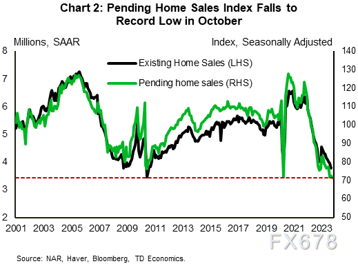 月度个人收入和支出报告在通货膨胀方面也带来了一些好消息。亮点是核心PCE(美联储首选的通胀指标)继续减速,10月份同比增速从上月的3.7%降至3.5%(图1)。随着美联储向2%目标的持续推进,利率有所下降,抵押贷款利率也是如此。30年期抵押贷款利率目前徘徊在7.2%附近,比10月中旬8%的峰值低了约80个基点。这种回落似乎为住房市场提供了一些缓解,上周抵押贷款购买申请连续第四周上升。但是,利率的影响往往是滞后的,所以这需要一段时间才能在销售活动中体现出来。为此,10月份待售房屋销售降至历史最低点,表明情况在好转之前可能会变得更糟(图2)。