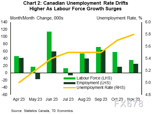加拿大劳动力市场也在放缓,但还没有完全失去优势。11月份,加拿大新增2.5万个就业岗位,将就业增长的三个月趋势略微拉低。然而,自4月份以来,失业率已经上升了80%(图4),因为劳动力增长继续超过就业增长。劳动力市场在周期的这一点上保持相对良好,但加拿大银行(BoC)可能希望看到市场进一步走向平衡。值得注意的是,工资涨幅仍然强劲,这可能会加剧未来的通胀担忧,而职位空缺虽然有所下降,但仍处于高位。