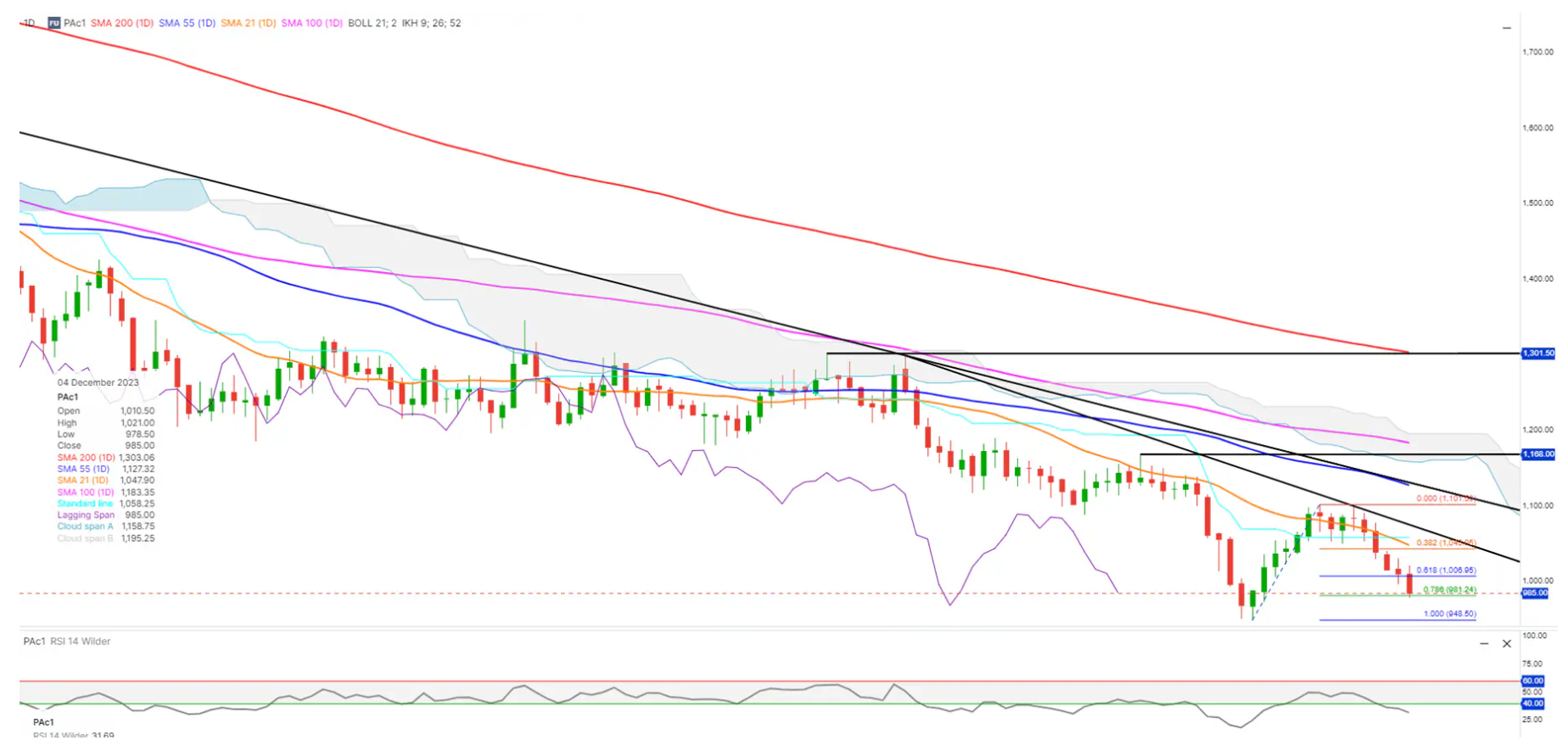 钯金在小幅调整后恢复看跌趋势,并可能很快测试11月低点948.50美元左右。收盘低于850美元可能会导致进一步抛售。钯金收盘于1,102美元之上将形成上升趋势。