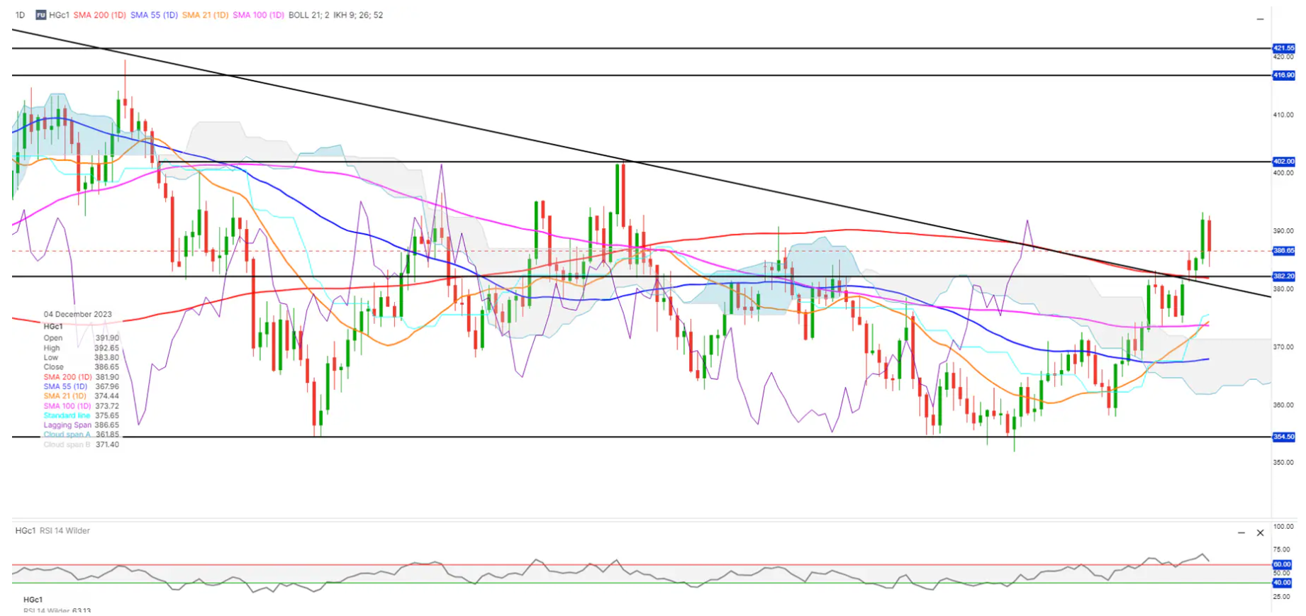 收盘价低于382美元和200日移动均线将打破看涨局面。RSI指标的积极情绪正在支撑铜价走高。