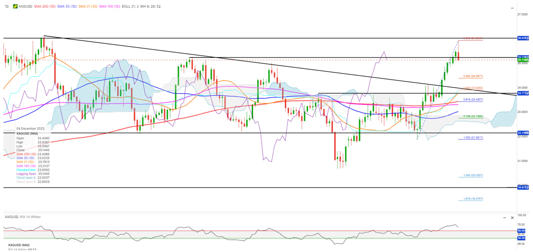 根据Saxo Bank分析师Kim Cramer Larsson的分析,白银价格飙升至仅比阻力位26美元左右低几美分。可能会出现回调,跌至0.382回撤位24.38美元。