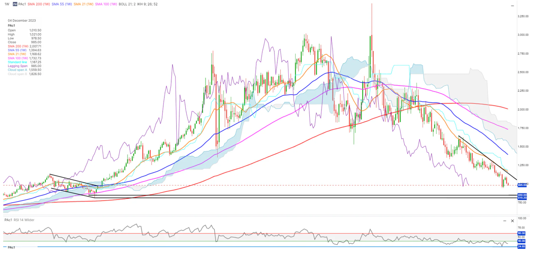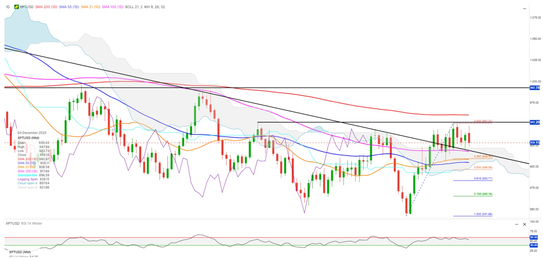 铂金目前仍然落后于其他贵金属,并在950美元阻力位屡次被拒。价格需要收盘于该点位上方才能获得上行动能。
