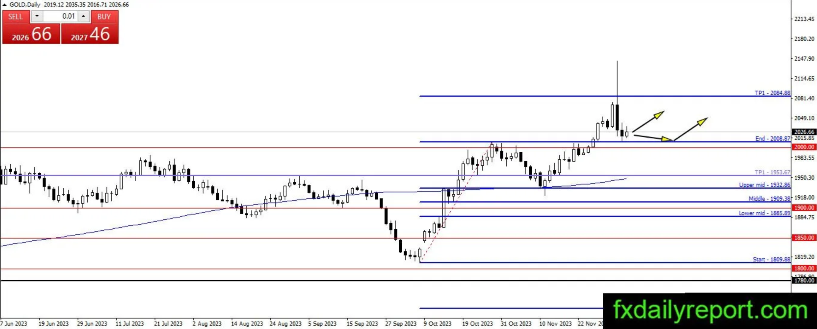 金价的下跌可以说是持续的获利了结反应。这一下行走势正在测试2,000美元附近的关键水平,并将等待进一步的反应。当出现强劲的看涨反弹时,金价将继续其看涨趋势。