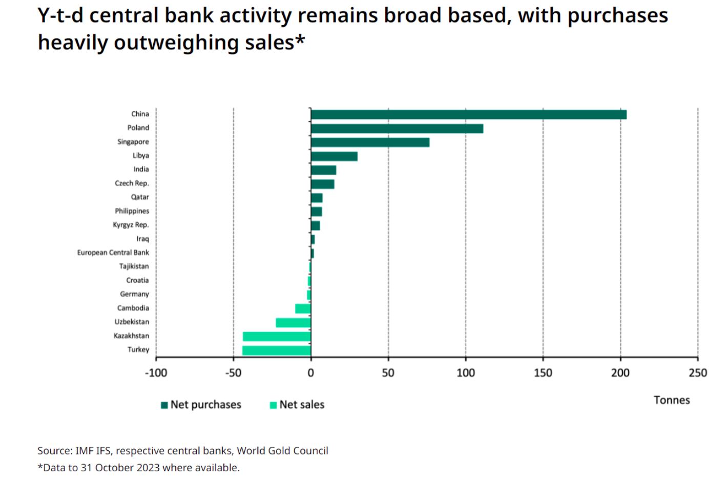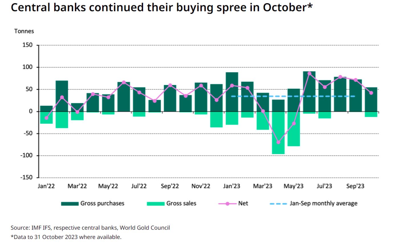 “甚至在 10 月份的净买入之前,我们就注意到 2023 年可能是央行购买的又一个巨大的一年,”Gopaul 写道。“在第四季度开局积极之后,今年的央行需求似乎将进一步攀升。”