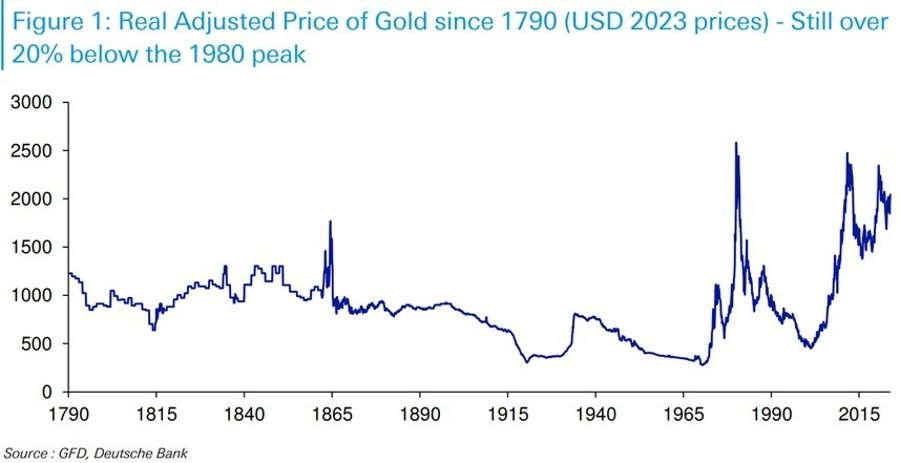 该行表示,图表显示经通胀调整的黄金实际价格将重返1790年。尽管名义汇率达到了历史新高,但仍比1980年经通胀调整后的峰值低20%以上。