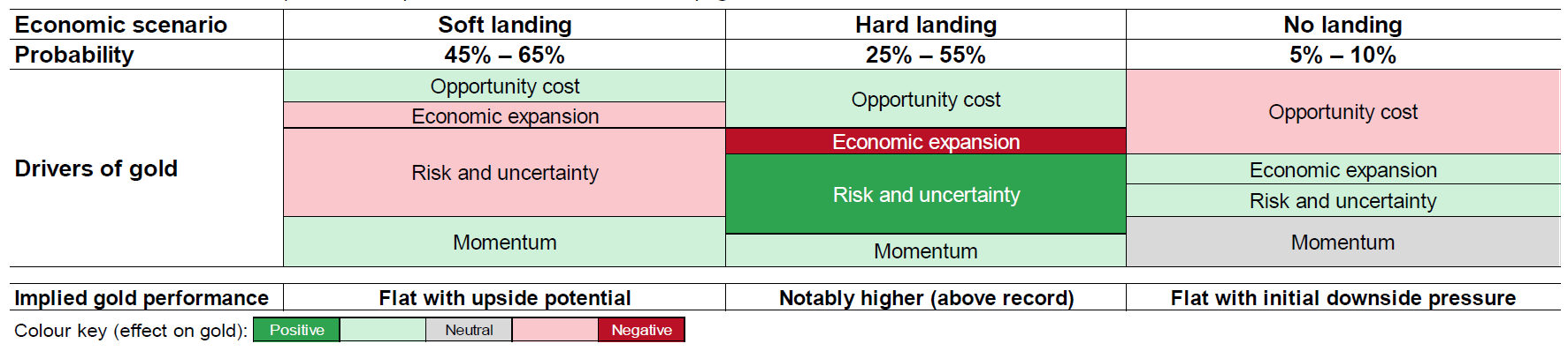 第三种可能性较小的情况是“不着陆”结果,其特点是在美国制造业反弹和实际工资复苏的推动下,通胀和增长重新加速。然而,世界黄金协会指出,这与其说是一个结果,不如说是一种临时状态,并引用了摩根士丹利的描述:“不着陆只是等待发生的软着陆或硬着陆。”