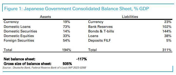分析的起点是圣路易斯联储和国际货币基金组织(IMF)的两篇优秀论文,它们整合了日本政府的资产负债表,包括日本央行、日本国有银行即邮政银行,以及养老基金即GPIF,这是世界上最大的养老基金。鉴于日本公共债务/GDP比率超过200%,且持续上升,债务整合对于理解为什么近几十年来日本没有面临债务危机至关重要。