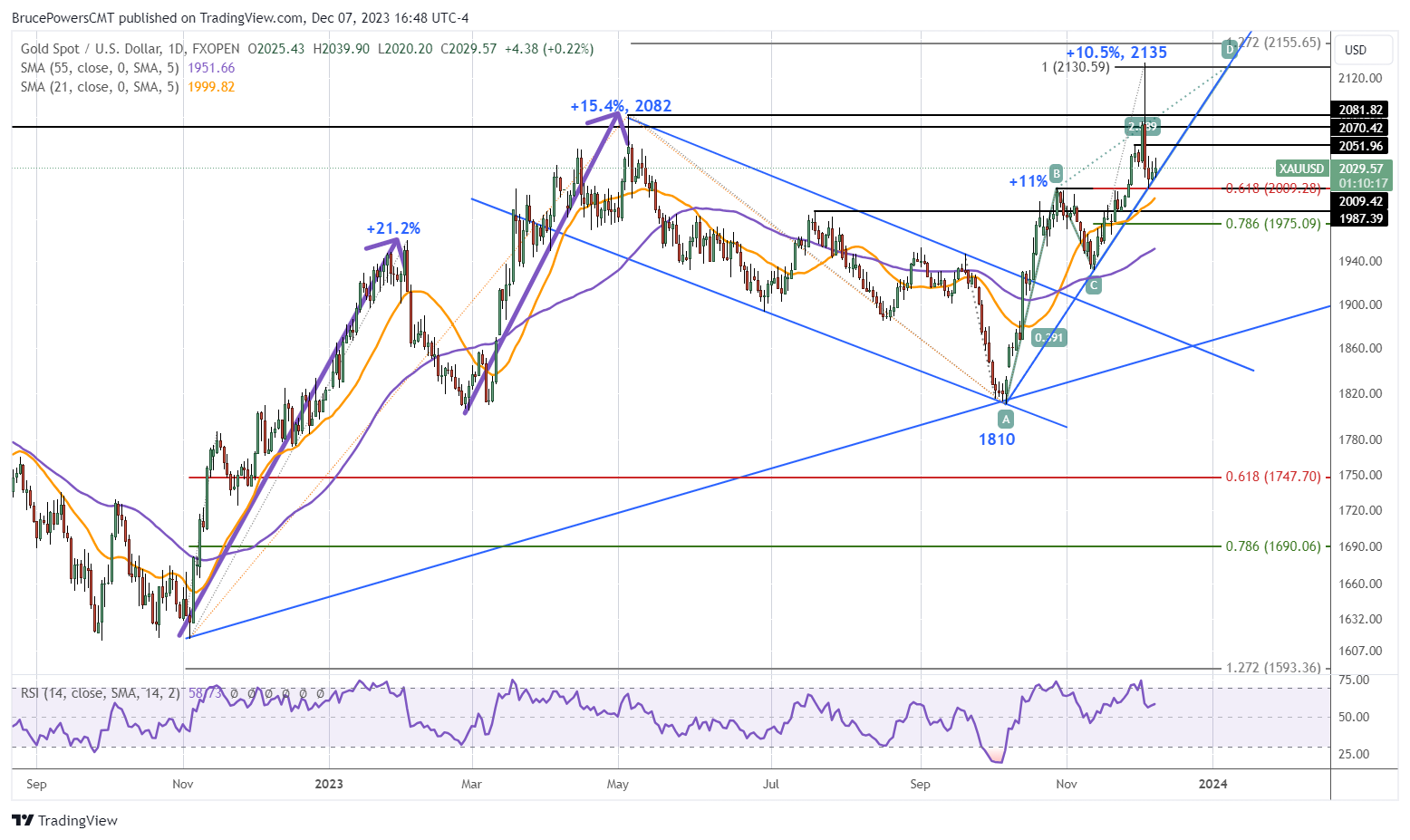 跌破周四低点是短期利空,近期波动低点2010美元有被跌破的风险。如果出现这种情况,潜在的支撑包括位于2000美元的21日均线、位于1987美元的前期波动高点,以及位于1975美元的78.6%斐波那契回撤位。上周的上涨引发了月线图上的向上突破,市场现在正在经历这次突破后的回调。由于月度图表涵盖了更长的时间范围,因此突破新高的意义重大,并增加了黄金最终上涨的机会。